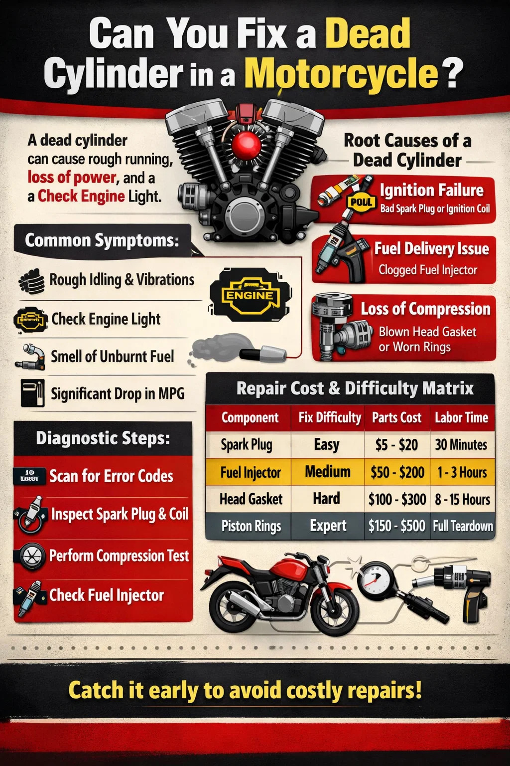 Ak je zapaľovacia sviečka zanesená alebo zlyhala zapaľovacia cievka, zmes je špecifická motocyklový valec nezapáli sa. Výmena zapaľovacej sviečky je najbežnejším riešením. Ak je cievka mŕtva, jej výmena za cievku z pracovného valca je skvelý spôsob, ako otestovať, či sa „smrť“ presunie na nové miesto.