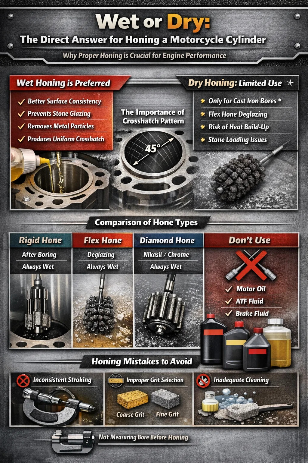 Pri honovaní a motocyklový valec , Vo väčšine situácií je odporúčaná metóda mokrého honovania . Použitie honovacieho oleja alebo lubrikantu na báze ľahkého petroleja počas procesu odstraňuje kovové častice, udržiava honovanie čisté, zabraňuje glazovaniu na brúsnych kameňoch a vytvára konzistentnejší vzor krížového šrafovania na stene otvoru. Suché honovanie sa používa iba vo veľmi špecifických scenároch - zvyčajne s určitými flexibilnými kefovými honmi na liatinových otvoroch - a aj vtedy skúsení strojári často uprednostňujú aspoň ľahkú hmlu maziva.