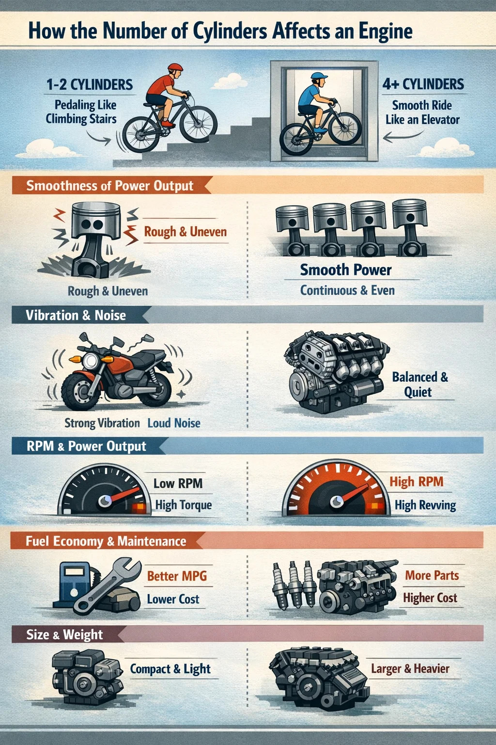 Zdokonalenie: Motory s menším počtom valcov majú väčší vplyv pri každom spaľovaní a vibrácie sú priamejšie (preto niektoré veľké jedno- valcové motocykle môže spôsobiť znecitlivenie rúk po dlhšej jazde). S viacerými valcami je sila každého spaľovania menšia, zvuk je kultivovanejší a na voľnobeh je tichší.