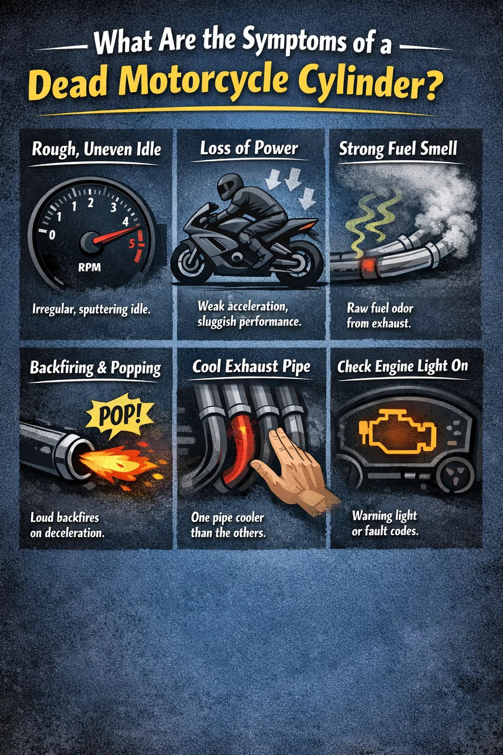 Najpriamejšia odpoveď: ak váš motocykel jazdí nerovnomerne, má výrazne znížený výkon, páchne ako nespálené palivo alebo zlyhá pri voľnobehu a pri zaťažení, existuje veľká šanca, že jeden z vašich valcov prestal strieľať. Tento článok vás prevedie každou metódou, ako to potvrdiť, čo to spôsobuje a ako to vyriešiť.