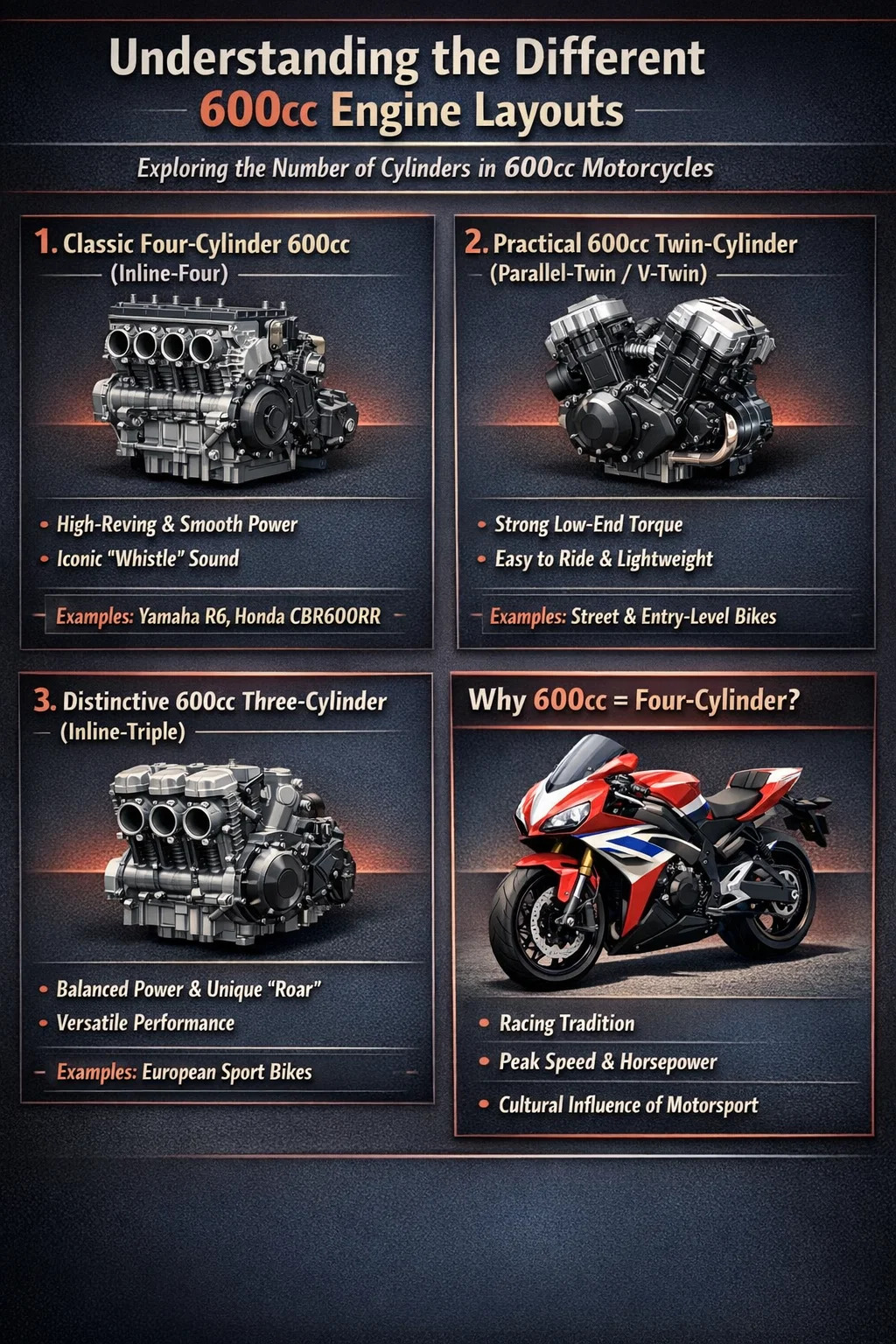 „600cc“ predstavuje zdvihový objem motora (celkový objem všetkých valcov), podobne ako celkovú plochu domu. Počet valcov sa vzťahuje na usporiadanie miestnosti. V rámci triedy zdvihového objemu 600 cm3 je „dizajn miestnosti“ neuveriteľne rôznorodý.