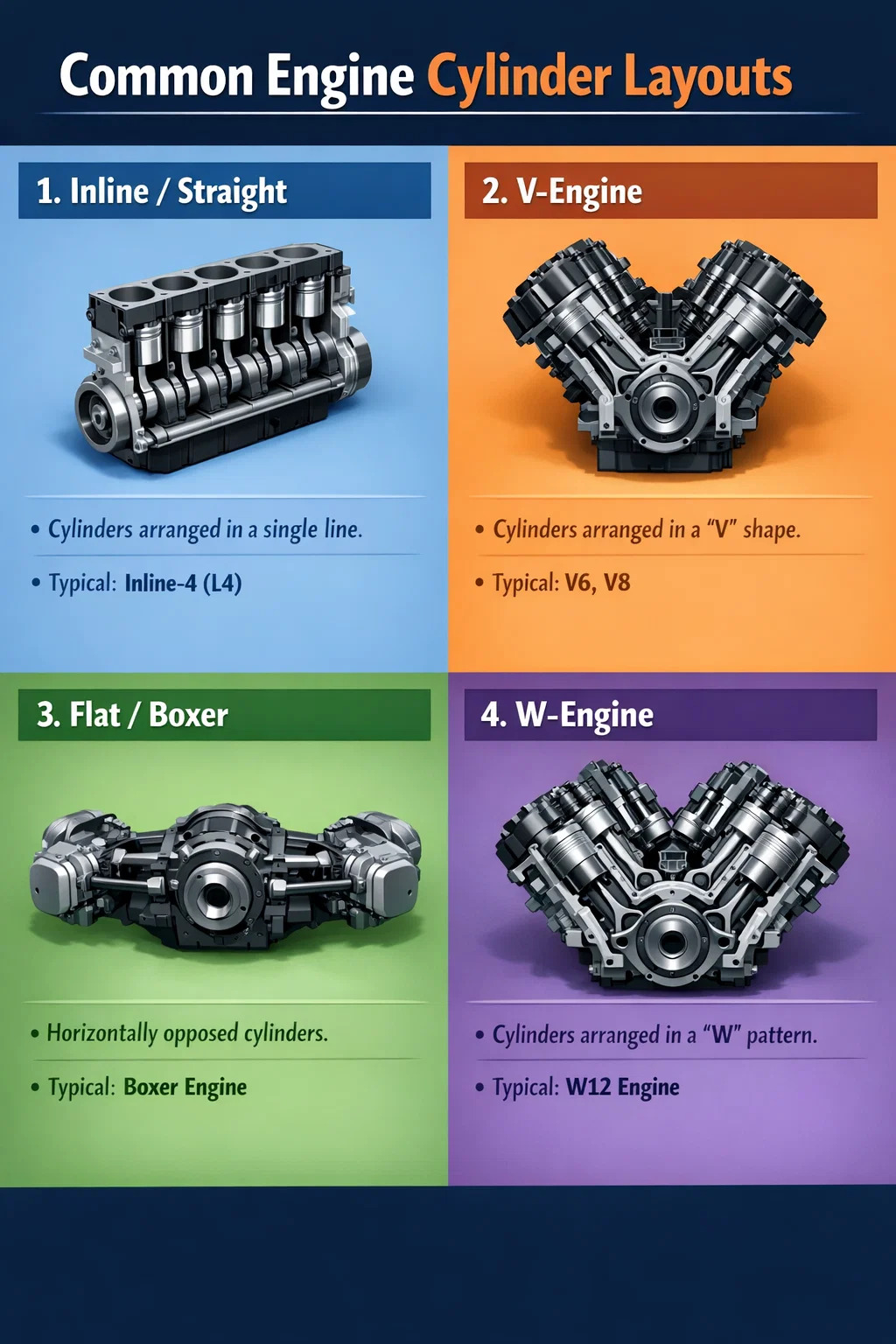 Použitie: Bežne sa vyskytuje v stredných až veľkých sedanoch alebo vysokovýkonných športových autách (ako V6, V8). Na poli motocyklov je V-twin klasika, známa pre svoj jedinečný rytmus a silný krútiaci moment pri nízkych otáčkach.