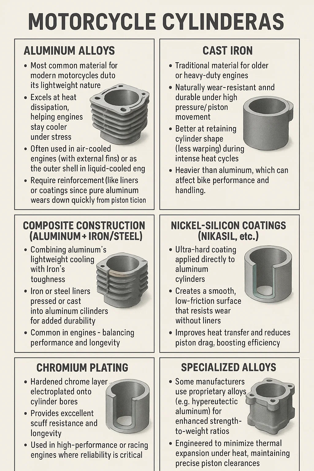 Motocykel valce sú primárne vyrobené z kovov vybraných pre pevnosť, tepelnú odolnosť a odolnosť. Tu je podrobný rozpis bežných materiálov a ich vlastností: